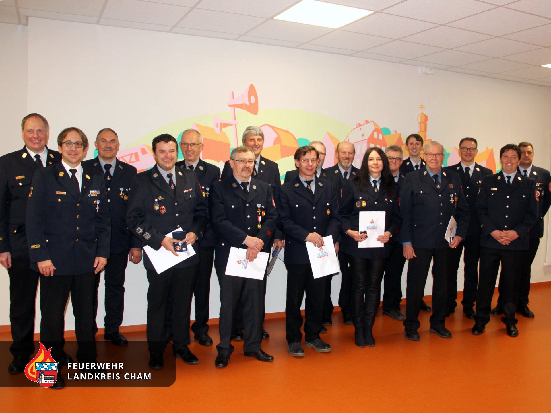 Feuerwehr-Ehrenkreuz des Kreisfeuerwehrverbandes Cham in Silber: Petra Fichtl (FF Schillertswiesen), Theodor Adlhoch (FF Siegenstein), Walter Fischer (FF Mitterdorf), Josef Schmid (FF Neubäu am See), Franz Senft (FF Gfäll), Reinhard Strasser (FF Großenzenried), Lothar Weber (FF Siegenstein)