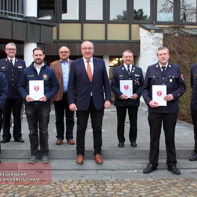 Am heutigen Dienstag fand im Landratsamt Cham die Ernennung durch Landrat Franz Löffler statt. Mit dabei waren neben dem scheidenden und dem neuen Kreisbrandmeister des Bereichs 3/2 der Kreisbrandrat Michael Stahl, Kreisbrandinspektor Marco Greil, sowie der Bürgermeister der Gemeinde Schorndorf Max Schmaderer. Neben der Neubesetzung des Kreisbrandmeisters wurden zum 1. März 2022 mit Richard und Martin Kreuzer auch zwei Fachberater PSNV für die FüGK und die ÖEL im Katastrophenschutz ernannt.